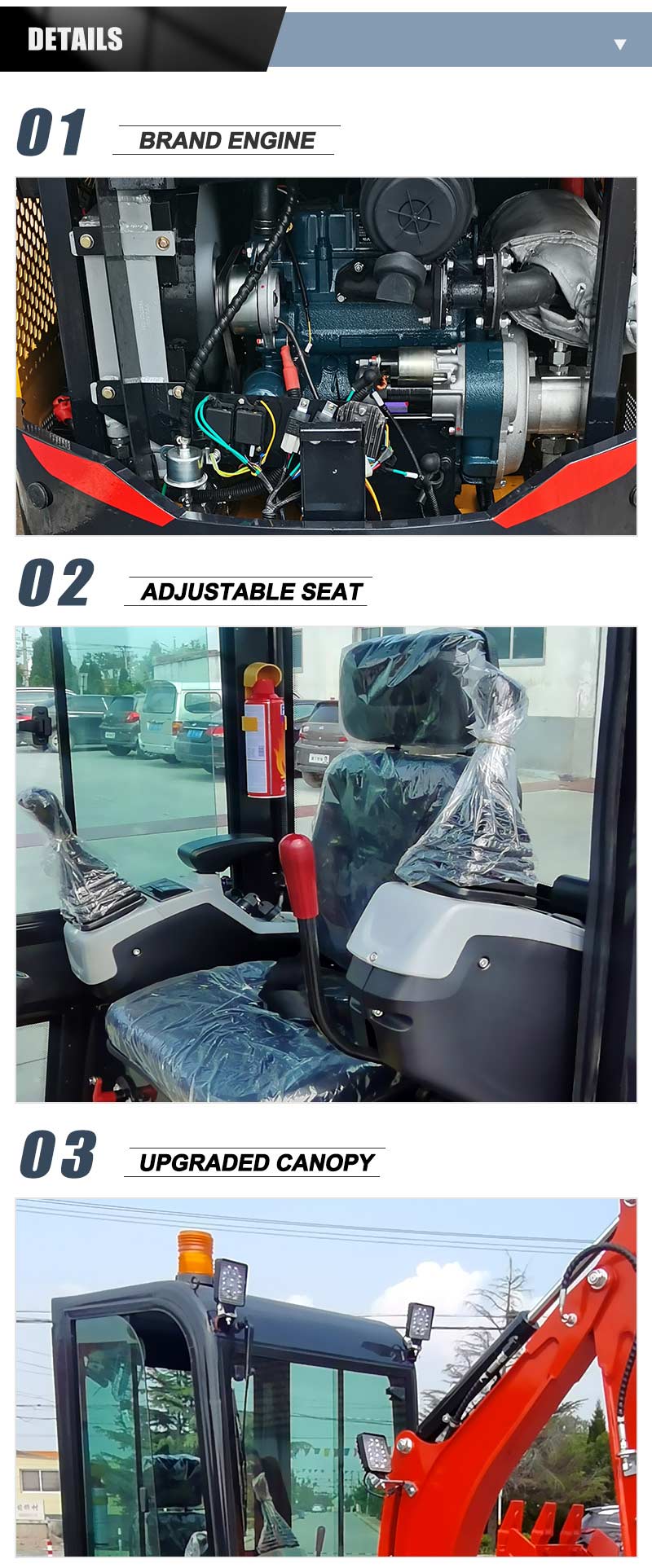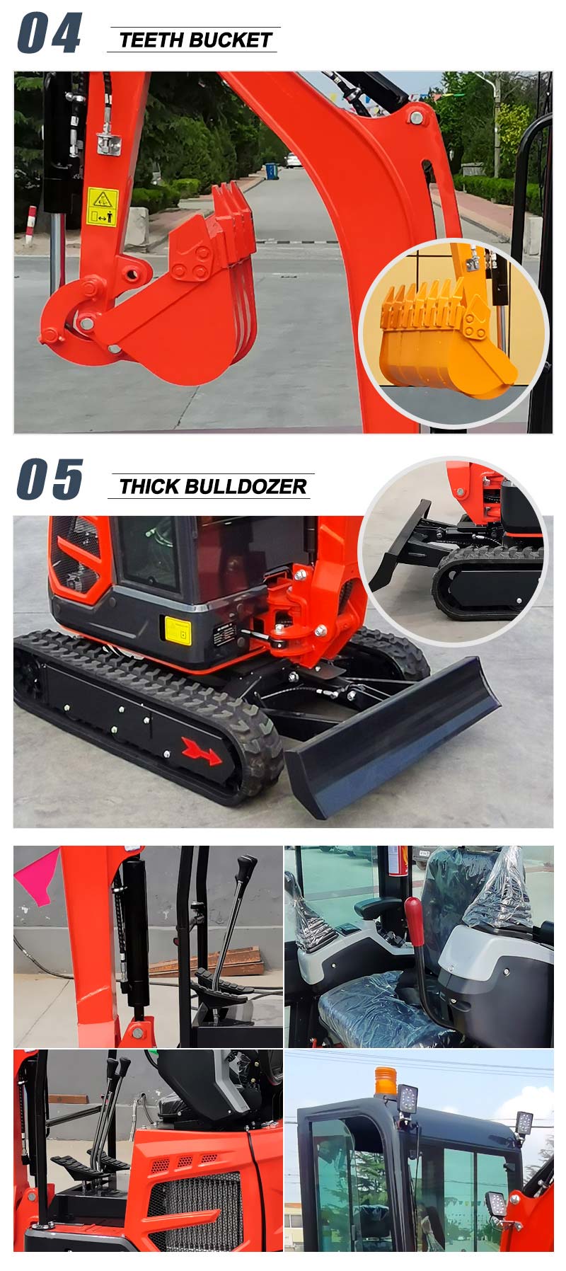 Opération facile:Conçue pour le confort de l'utilisateur, la mini-pelle est dotée de commandes intuitives et d'une cabine de conduite confortable. Les opérateurs peuvent rapidement apprendre à utiliser la machine en toute simplicité, augmentant ainsi la productivité et réduisant les temps d'arrêt.