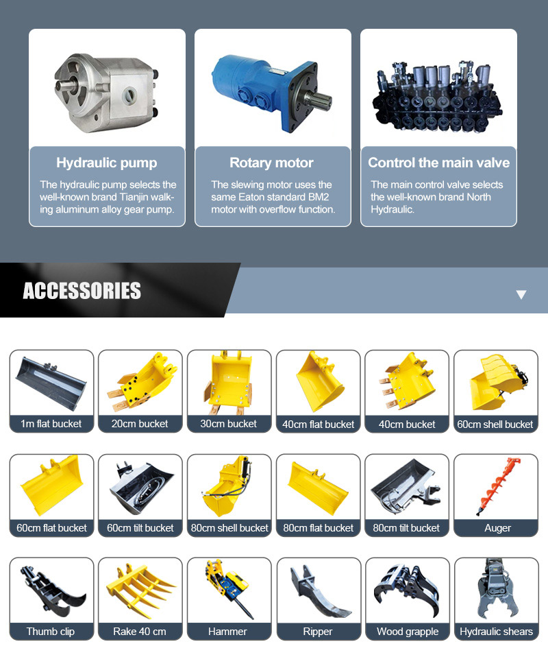 Capacité du godet 0,06CBM :Le godet de 0,06 mètre cube de la pelle est parfaitement adapté aux tâches d'excavation et de manutention à petite échelle. Qu'il s'agisse de creuser des tranchées, de charger des camions ou de niveler des surfaces, le godet offre des performances efficaces.